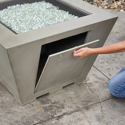 The Cove Square Gas Fire Pit Table is a must-have for any modern outdoor area. With its Natural Grey Supercast™ concrete material, the focal point is the striking 24" x 24" Square Crystal Fire® Plus burner. The individuality of the concrete adds to the charm of each fire pit, with unique color variations and casual pitting adding character.